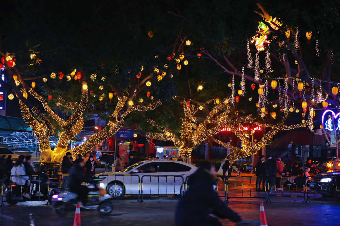 在临漳门环岛,高高的树梢上,七彩水母灯、幻彩鱼灯、七彩流星灯等彩灯,在夜空中摇曳,满天星灯带缠绕在树干上,星光熠熠,令人心醉。环岛四周则设置了“2024和鲤向未来”“海丝泉州,魅力鲤城”“世遗古城,与鲤同行”“鲤好2024”等主题造型灯,彰显泉州海丝文化,带给市民游客不一样的视觉体验。