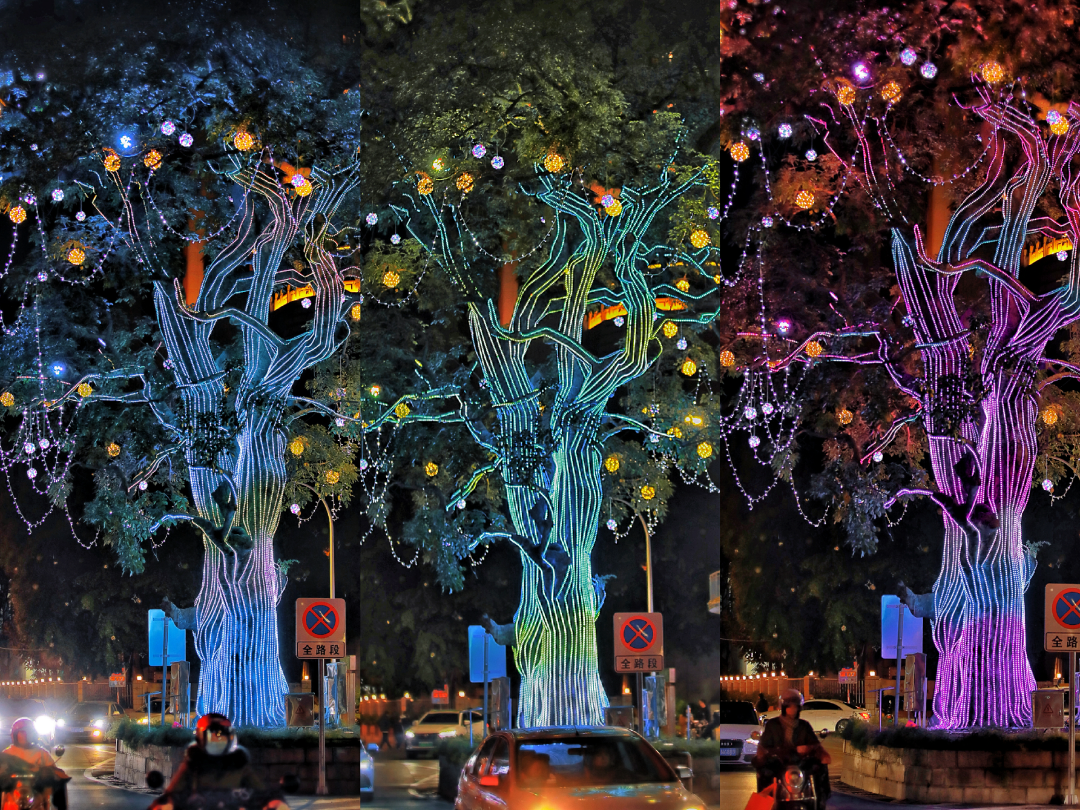 在濠沟墘,大树树干通体发光,光线沿着树脉向上流动四散,变幻着红、黄、蓝、绿、紫等五种不同色彩,搭配上树坛四周海浪造型的灯光,好似海浪一般生生不息,彰显出泉州“人生海海”“爱拼敢赢”的独特城市特质。