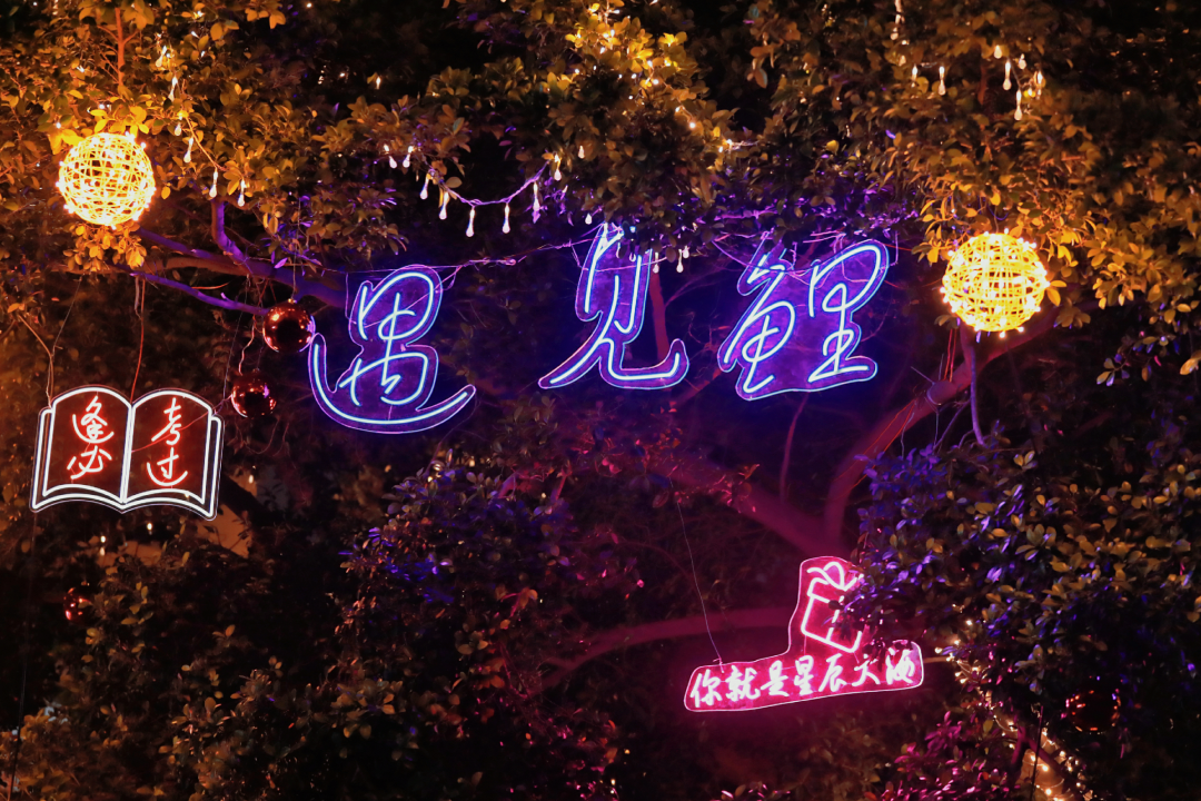 在南俊北路与学府路交叉路口中央,一棵许愿树矗立路中,“逢考必过”“金榜题名”“生活的理想”等心愿卡片随风摇曳,诉说着学子的期盼与憧憬。夜幕降临,灯光璀璨如繁星点点,照亮学子前行之路,更为他们注入希望与勇气。在“遇见鲤”主题下,学府路将继续见证鲤城教育辉煌,陪伴鲤城学子追逐梦想。
