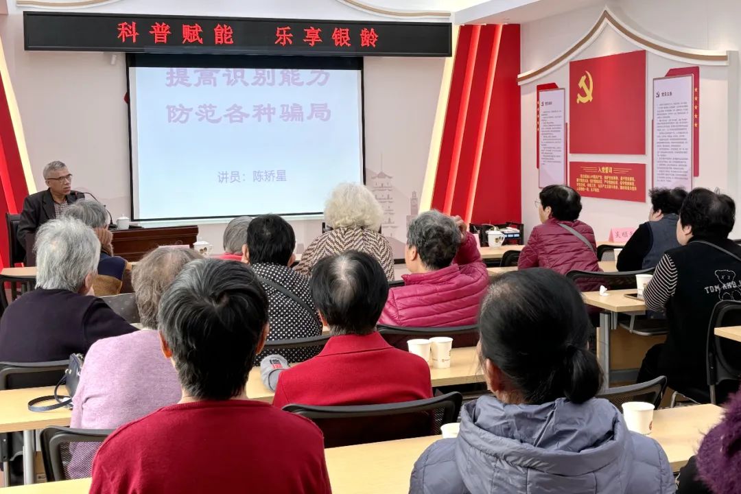 活动现场,电子工程师、中职讲师陈矫星以《提高识别能力,防范各种骗局》为题,结合典型案例,从磁疗和电疗骗局、养生保健品骗局、如何提高识别能力等方面展开介绍,为现场的老年朋友们带来了生动一课。