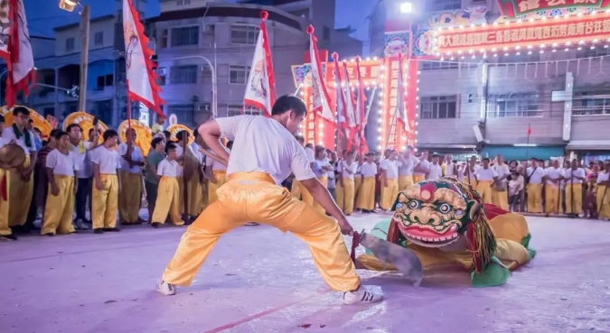 “每逢大型传统节庆活动总少不了‘青狮’助阵,相传为少林和尚‘一元祖师’创建,是闽南地区一项集武术与民间舞蹈为一体的活动。”张晓峰介绍,清乾隆二十八年(1763),泉州少林寺被焚,寺内武僧被迫遁入山野乡村,以舞狮形式保留武术套路,于农闲时聚众舞弄狮子,以此瞒过清廷耳目。因泉州历史上迎神赛会频繁,少不了“刣狮”队的参与,因而“刣狮”代代相传,保留至今。