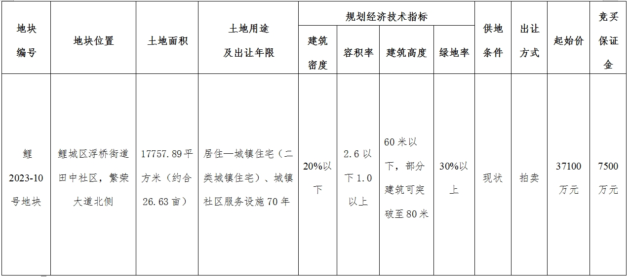 近日,记者从相关部门获悉,鲤2023-10号地块将于6月27日出让,地块占地面积约26.63亩,采用拍卖方式出让,按照“限房价,竞地价、价高者得”的原则确定竞得人,不设保留价。