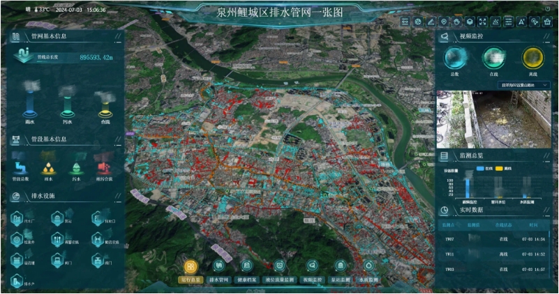 及时预警、迅速反应,这得益于鲤城区正在使用的“排水一张图”信息平台。该平台全面搭建管网数据、运维、信息管理等系统,并通过加装物联网设备,实现对雨污水泵站、排水管道、河道及积水点的实时监测与数据汇聚。目前,该平台进入试运行调整阶段,已整合排水管网总长约896公里,涵盖雨水、污水及合流管网,智能管理成效初显。