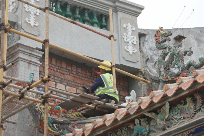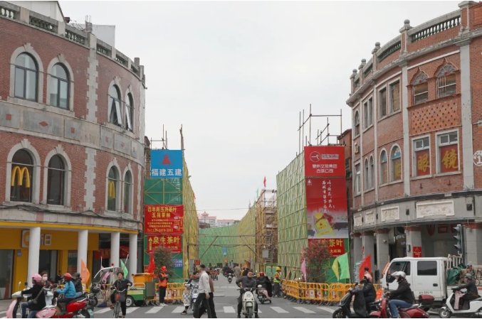 据介绍,针对骑楼外墙斑驳脱落,周边店面、住宅、配套等杂乱、破旧,街道功能分区混乱,各类电线、管道纵横交错的复杂情况,项目部对骑楼及巷弄中几百间老房子挨个进行“体检”,坚持“留、改、拆”并举,个性化定制修复方案,计划采取梁柱扩大截面法、置换混凝土法、钢结构加固法等多种措施,并结合闽南砖雕、清水砖墙、蚝壳墙、夯土墙、出砖入石等传统施工技艺,在改善人居环境、提升建筑性能的同时,坚持“修旧如旧、传统工艺”原则,重塑古城街巷的文化展示面。
