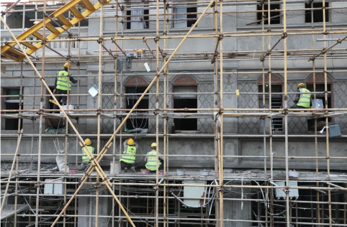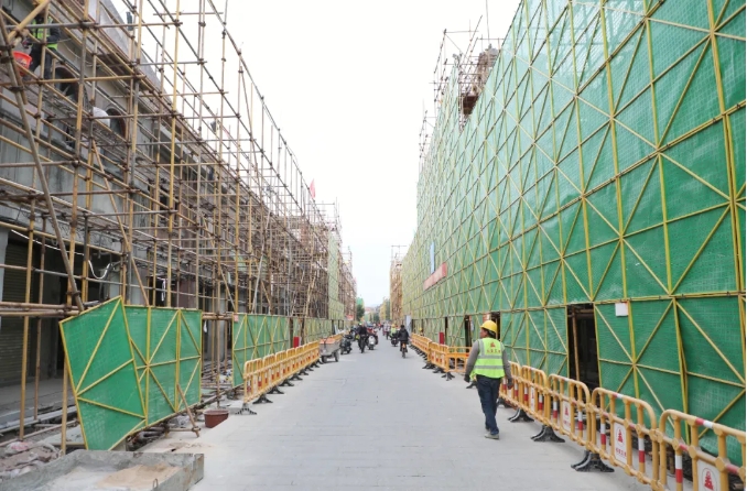 昨日,记者来到中山南路与新门街交叉路口,路中间一条平整的石板路在眼前缓缓铺开,电动车和行人都可以在上面走。两侧的骑楼外面架着脚手架,装着防护网,与路中间的石板路隔开来。一些店面前留有一条通道,供商家与顾客出入。在两侧防护网内,施工人员正忙碌作业,搬运、切割、砌筑、加固……紧张有序地推进这条百年老街外立面“旧貌”换“新颜”工作 。