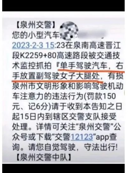 内容显示某车主因“单手驾驶汽车,右手放置副驾驶女子大腿处,有损泉州市文明形象和影响驾驶机动车注意力的违法行为”为由被交警监控抓拍并处罚。