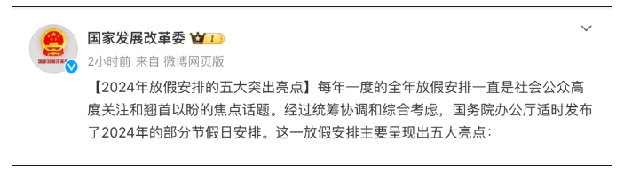 25日,@国家发展改革委 官方微博就此发布“2024年放假安排的五大突出亮点”。
