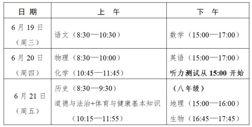 1.省级统一考试。2024年中考省级统一考试安排在6月19日—21日举行,具体科目考试时间安排如下: