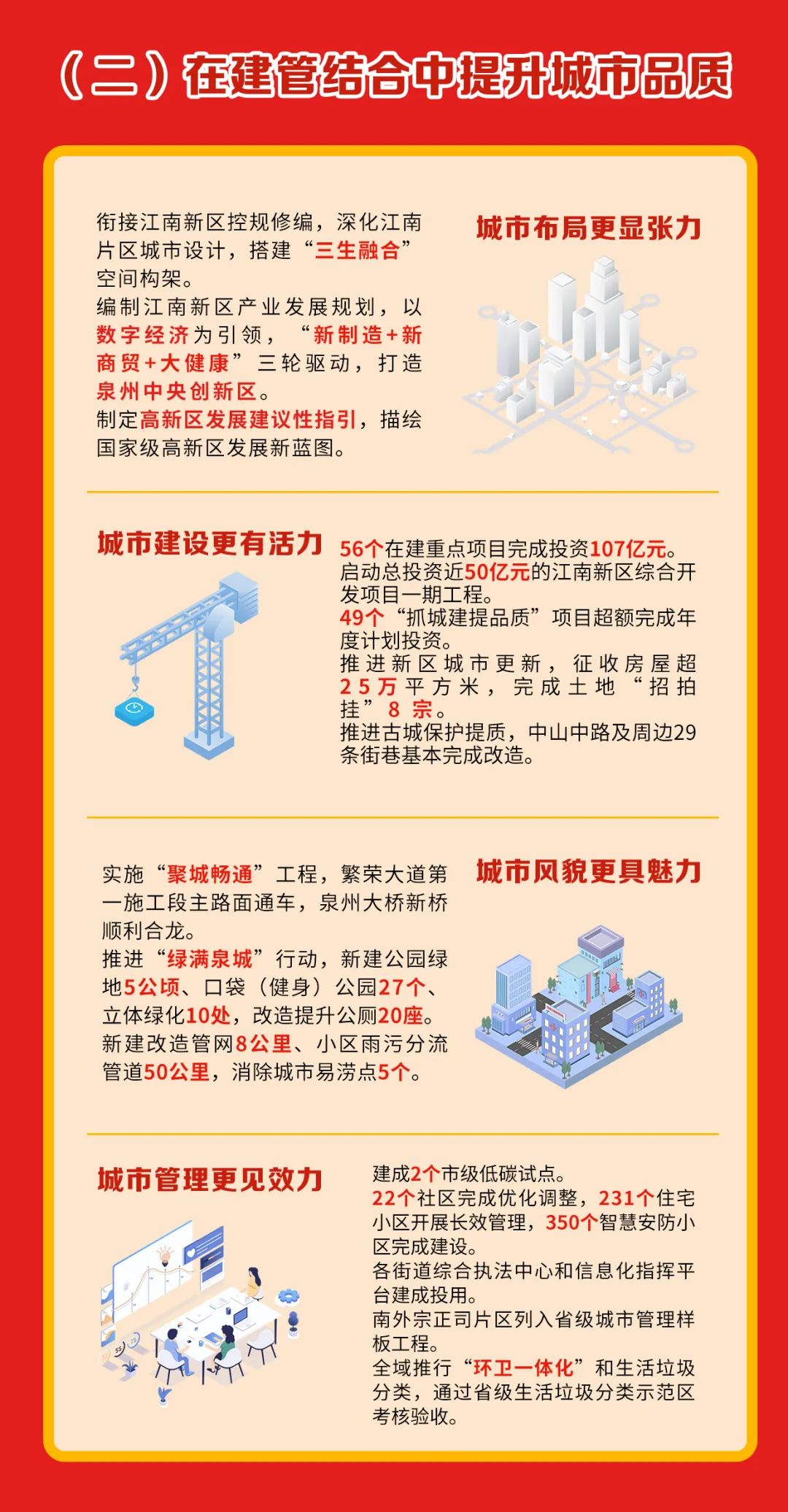 集聚头部资源高标准开发繁荣、站前西、金鲤等3大片区,力促16宗地块出让,加快10个商住项目建设,打造江南新区都市核心区。加快启动泉州演艺剧场综合体等文商旅项目,有效承接古城文旅功能外溢。实施“聚城畅通”行动,加速推进繁荣大道等3条主干道、金鲤大桥等2个跨江通道建设,启动泉南高速新增鲤城互通及接线工程。补齐公共配套设施短板,建设变电站、大型垃圾转运站,加快5G基站布局。