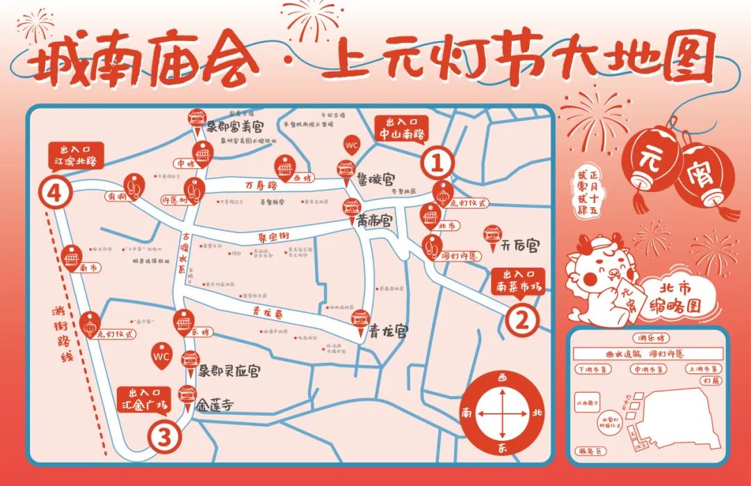 本次城南庙会·上元灯节首次南门大地图全开,路线遍布天后宫天后路-??济门遗址广场-万寿路-聚宝街-青龙巷-聚宝便民市场以及周边区域和街巷。