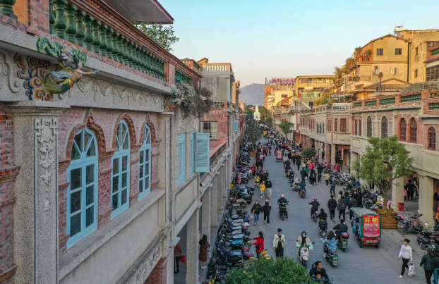石条铺成的街道两旁,各种各样的骑楼建筑彰显着民国风。(陈英杰 摄)