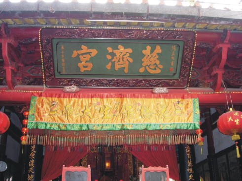 殿前上方悬有由元代著名书法家赵孟頫书写的“慈济宫”匾额,笔墨饱满,金光灼灼。大殿龛内供奉保生大帝神像三尊,龛前案桌上供奉印、剑童及吴真人的门徒江仙官、张圣者各一尊,另有土地公一尊,案桌左边有虎、鸡、狗三尊塑像,俗称“三舍爷”,据史料记载,吴真人生前曾为它们医好病,三畜很感激,一直跟随在其身边不愿离开,真人升仙后也同登仙境。大殿北侧为“仙姑亭”,供奉真人门徒鄞仙姑,龛前正中供奉明朝敕封的保生大帝圣父母牌位一方。