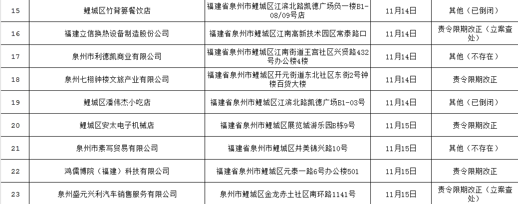 为强化社会面火灾防控,确保辖区火灾形势持续稳定,根据《中华人民共和国消防法》、《消防监督检查规定》、《福建省“双随机、一公开”消防监督抽查实施细则(试行)》等法律法规及文件规定,11月1日—15日,鲤城区消防救援大队按照随机抽取检查对象,随机选派检查人员的抽查机制,依法对辖区23家单位场所进行消防监督抽查。现将抽查结果公示如下: