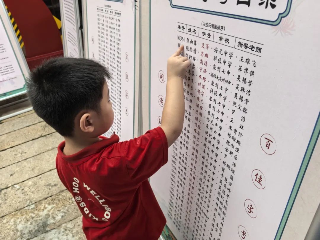 9月11日至9月24日,由泉州市委宣传部、市委网信办、市教育局指导,鲤城区委宣传部、区委史志室、区教育局、团区委、区社科联联合主办的鲤城区第二届“阅读经典·以字明志”主题活动之“百佳字号”巡回展在常泰街道下店社区党史学习教育基地展出。此次展览展示了来自鲤城区多所中学的100名学生为自己精心选取的字号,其丰富的文化内涵,吸引了众多社区居民、学校师生及家长的参观和热议。