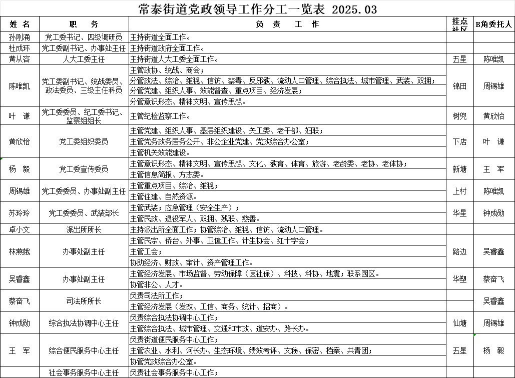 | 姓 名 | 职 务 | 负 责 工 作 | 挂点社区 | 互为AB角 |