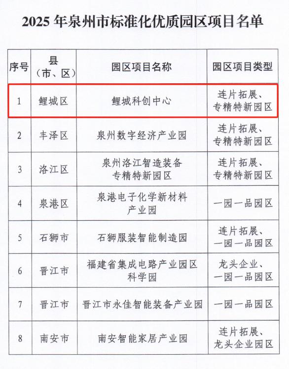 近日,2025年泉州市标准化优质园区项目名单正式公布。鲤城高新区科创中心榜上有名,被评为泉州市级标准化优质园区项目(连片拓展、专精特新园区类型)。