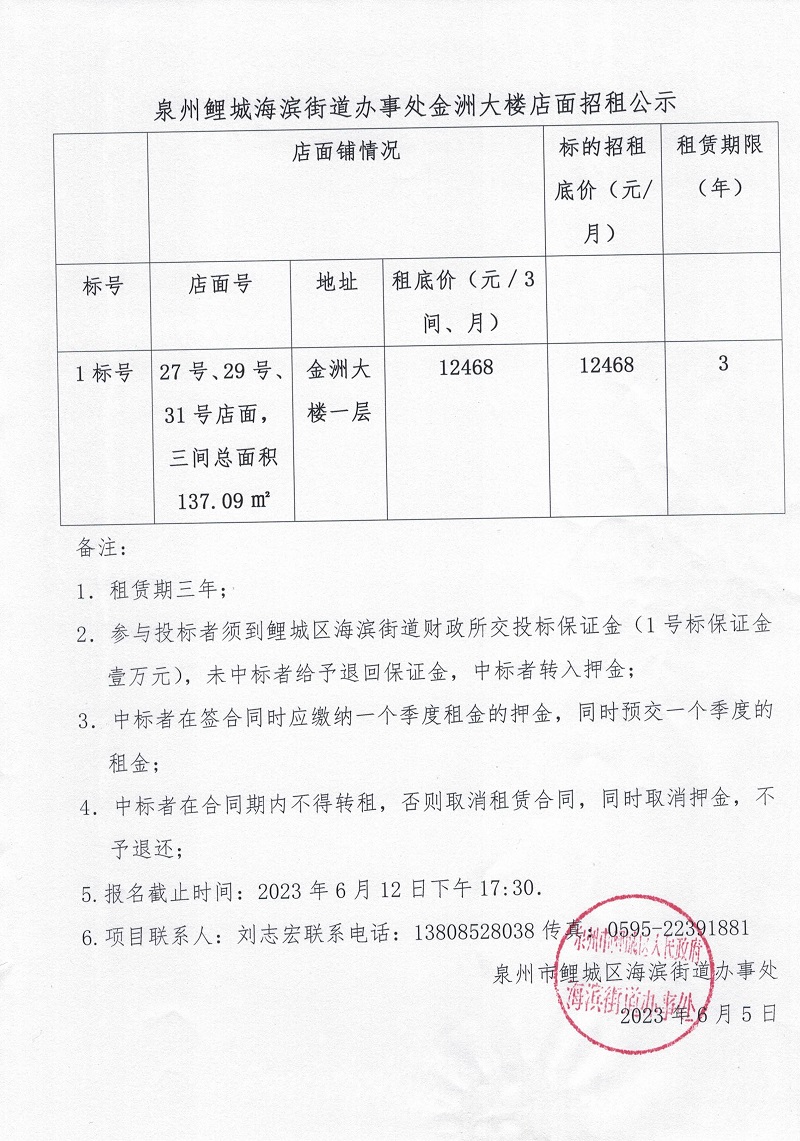 鲤城区海滨街道办事处金洲大楼店面招租公告