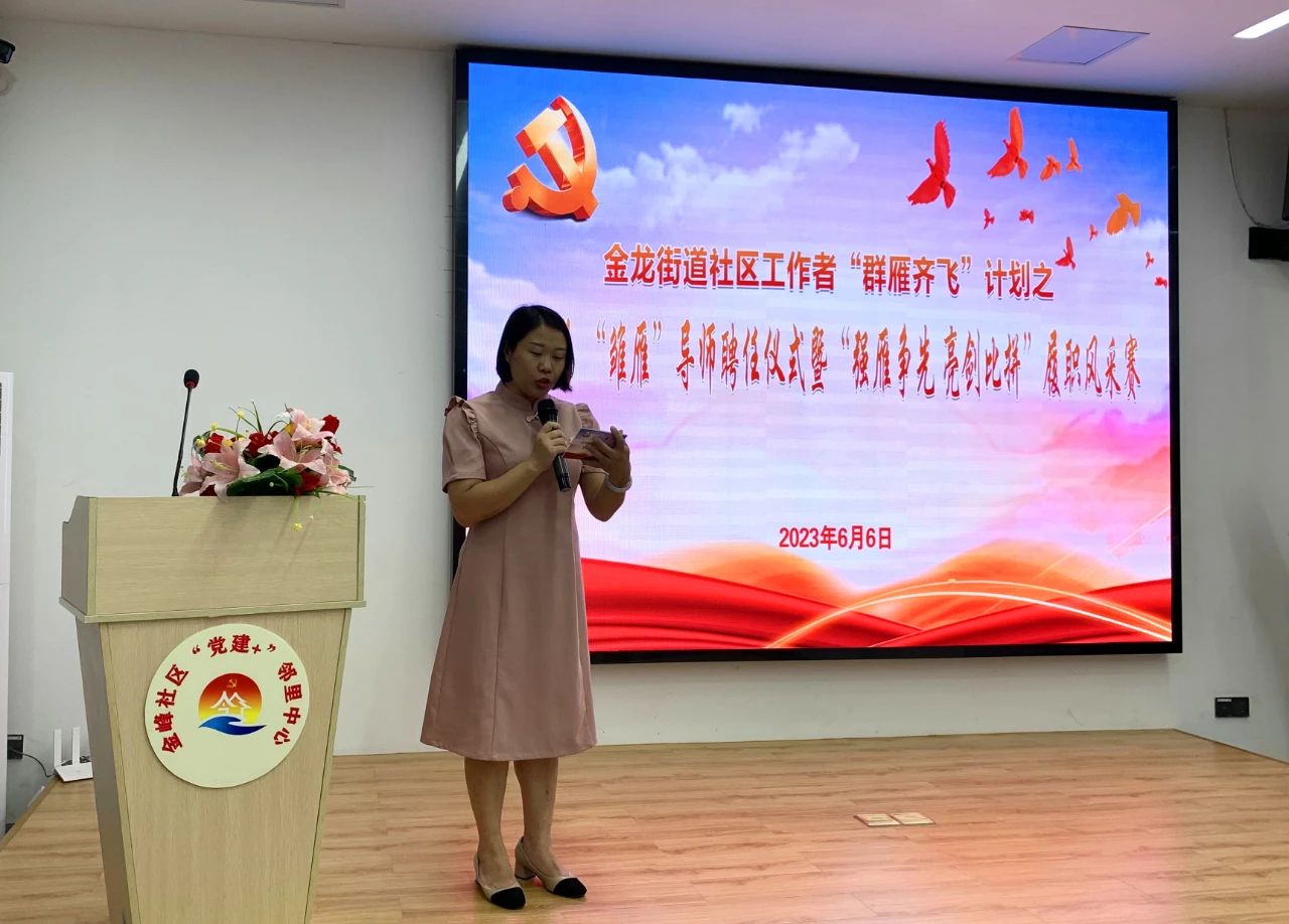 6月6日,金龙街道在金峰社区“党建+”邻里中心举行社区工作者“群雁齐飞”计划之“强雁”“雏雁”导师聘任仪式暨“强雁争先 亮剑比拼”履职风采赛。街道党政领导班子成员、各部门负责人、各社区书记、“强雁”、“雏雁”人选共计50余人参加。