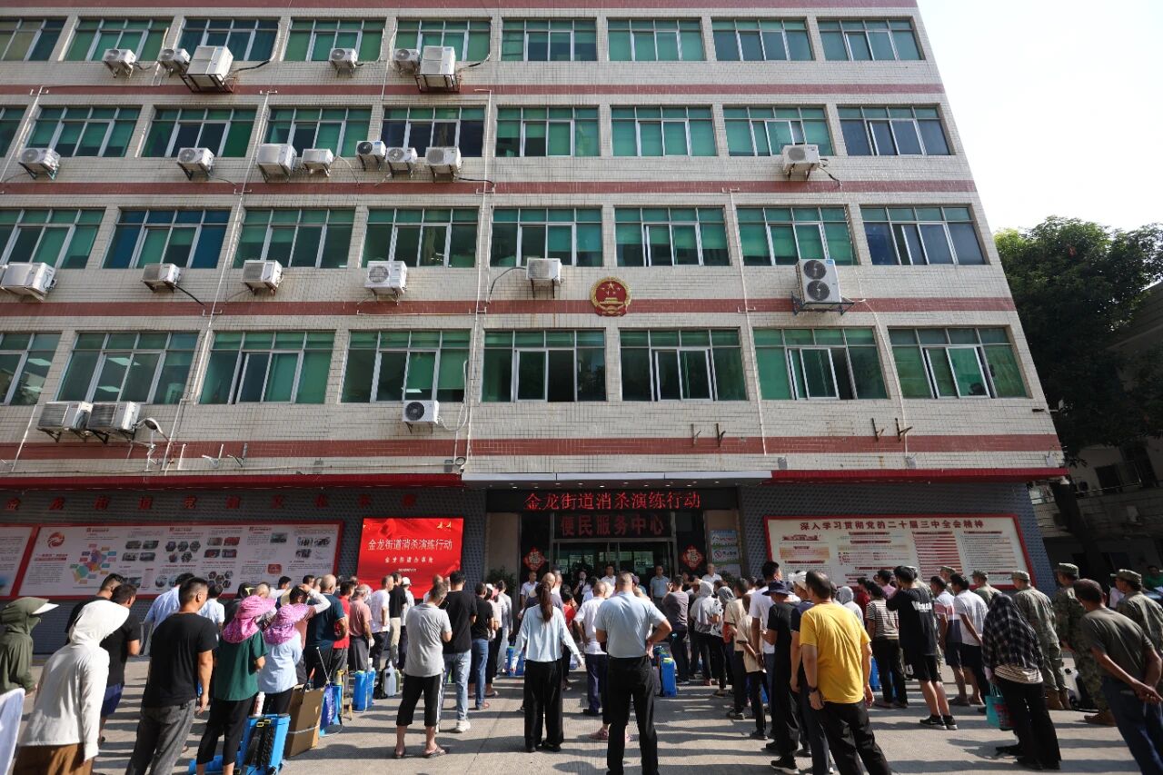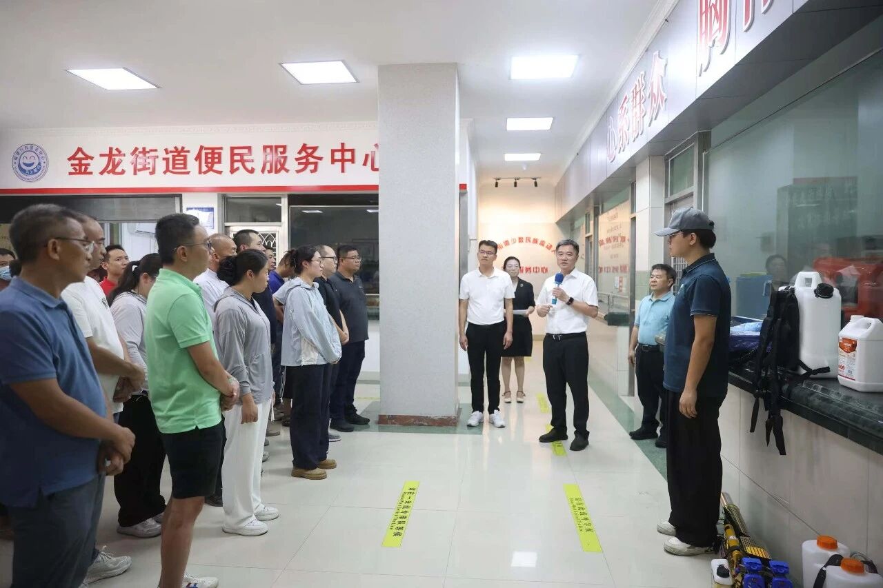 为扎实做好夏秋季蚊媒传染病防控工作,进一步强化应急响应机制,全面提升辖区消杀队伍专业能力,9月15日下午,金龙街道组织开展爱国卫生运动消杀演练。区委副书记、区长李垂举现场指导工作,区人大常委会党组副书记、副主任高云飞全程督导,街道党工委副书记、办事处主任王银水作动员讲话。演练集结挂钩社区的区直部门领导、街道党政班子成员、社区主干、街居两级消杀队伍、物业公司及民兵应急队等393人,通过“理论培训+实战操作”相结合的方式,全面检验辖区消杀队伍的应急响应能力。