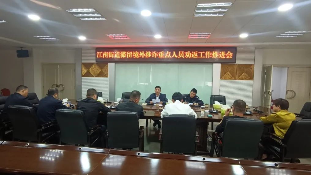 为深入贯彻落实习近平总书记重要指示批示精神及中共中央办公厅、国务院办公厅《关于加强打击治理电信网络诈骗违法犯罪工作的意见》和市委、区委研究涉诈重点人员管控工作专题会精神,遏制街道出境从事电信网络违法犯罪活动人员,切实维护、提升群众财产安全和切身利益,4月11日下午,街道党工委召开江南街道滞留境外涉诈重点人员劝返工作推进会,工作专班常务副组长、街道党工委副书记齐继栋、江南派出所刑侦中队长陈少峰、综治办工作人员、相关下居民警、社区书记、综治员等参加会议。