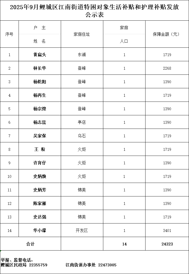江南街道2025年9月发放特困发放花名册