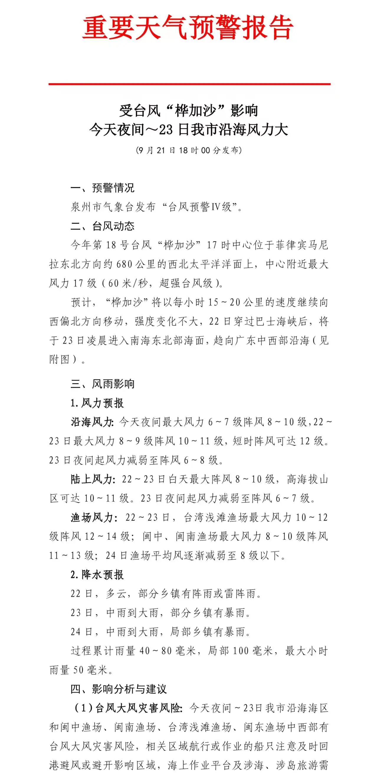 今年第18号台风“桦加沙”今日17时中心位于菲律宾马尼拉东北方向约680公里的洋面上,中心附近最大风力17级,预计“桦加沙”将以每小时15~20公里的速度向西偏北方向移动,22日凌晨进入我省台风警戒区,并于24日凌晨至下午在广东沿海登陆,登陆时强度可达强台风级或超强台风级。市气象台9月21日18时发布“台风预警IV级”,根据《泉州市防汛防台风抗旱应急预案》有关规定,市防指决定9月21日18时启动防台风IV级应急响应。请各成员单位和各县(市、区)防指密切关注台风后续发展趋势,强化指挥调度,扎实做好台风防范应对工作。