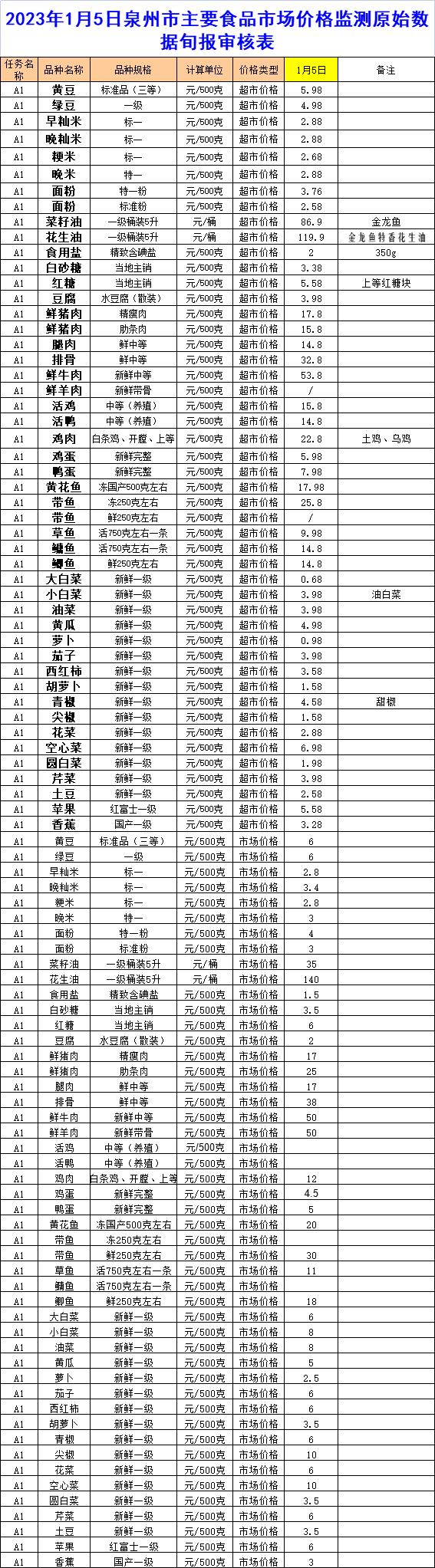 2023年1月5日泉州市主要食品市场价格监测原始数据审核表