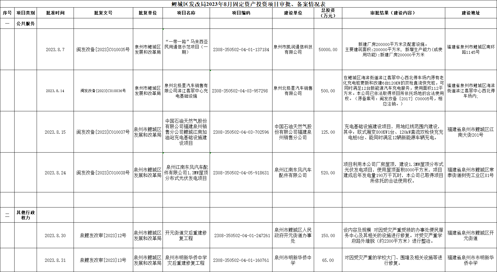 鲤城区发改局2023年8月固定资产投资项目审批、备案情况表