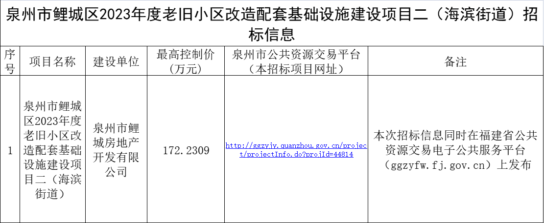泉州市鲤城区2023年度老旧小区改造配套基础设施建设项目二(海滨街道)招标信息