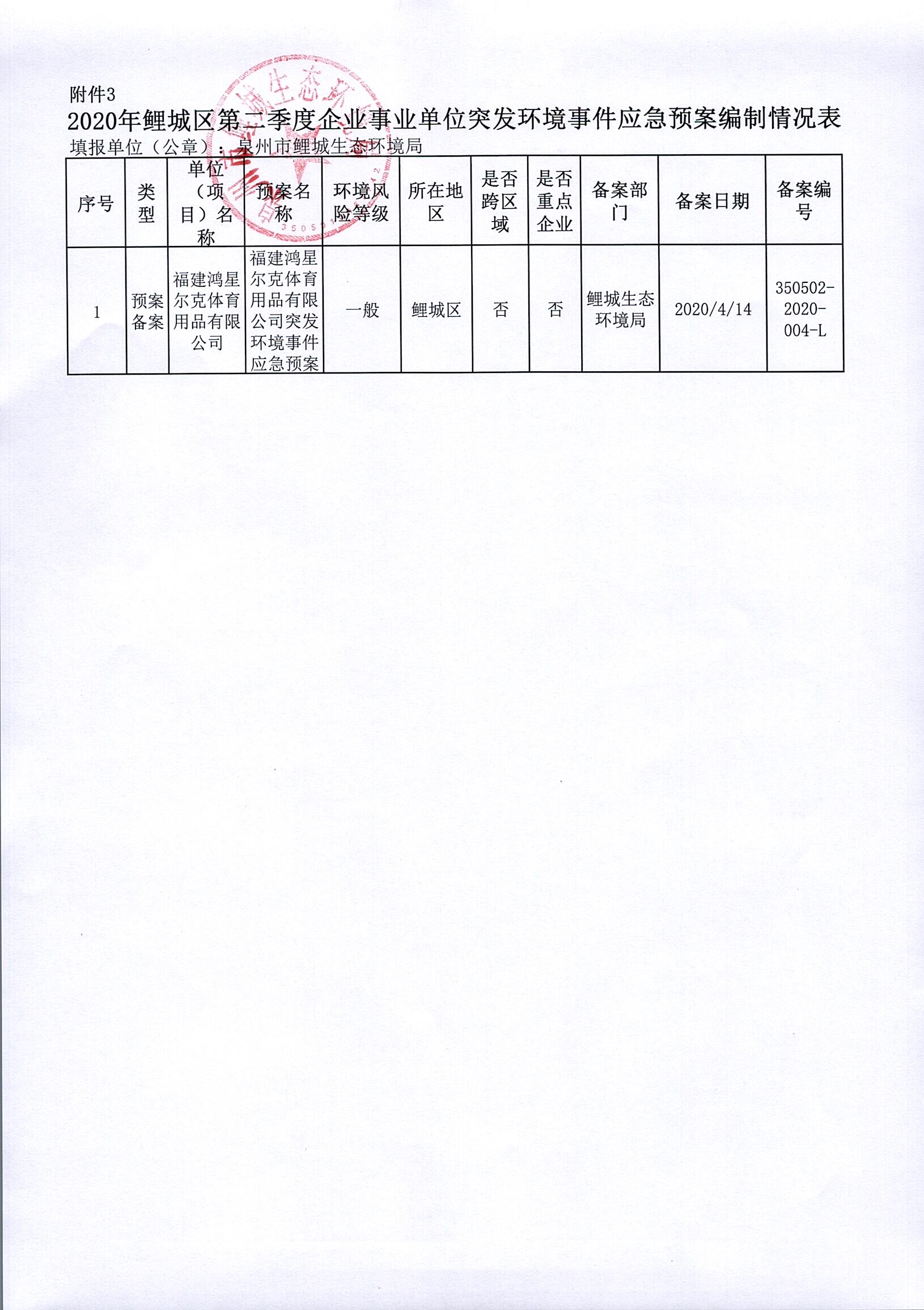 2020年第二季度鲤城区企业事业单位突发环境事件应急预案编制情况表