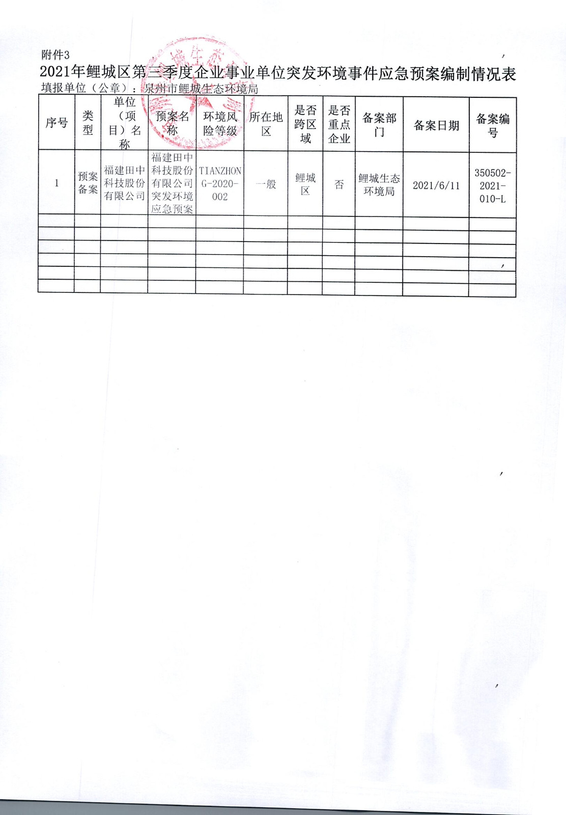 2021年第3季度鲤城区企业事业单位突发环境事件应急预案编制情况表(详见附件)