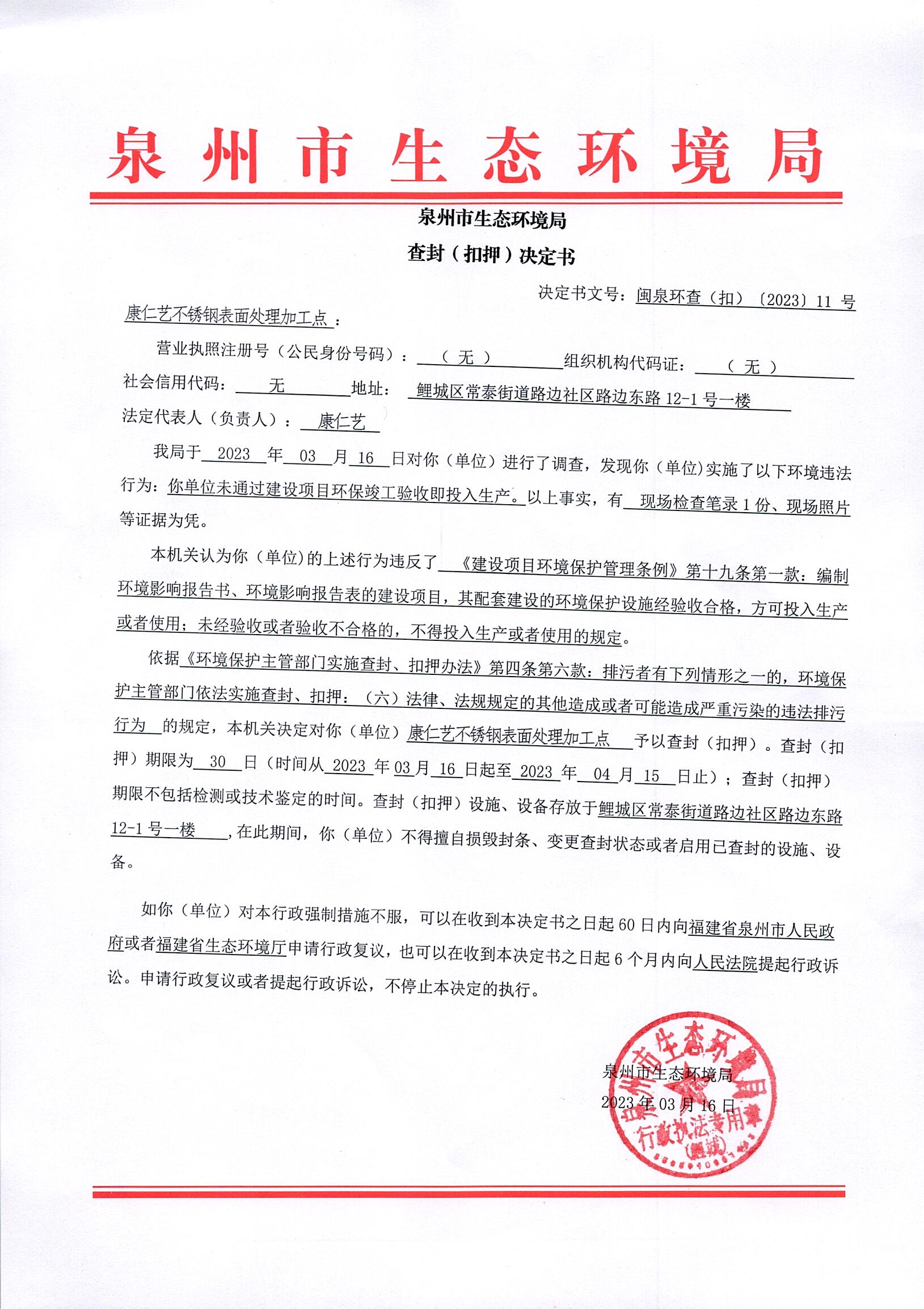 查封(扣押)决定书 闽泉环查(扣)〔2023〕11号