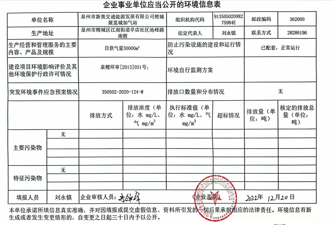 泉州市新奥交通能源发展有限公司鲤城展览城加气站2022年环境信息公开表