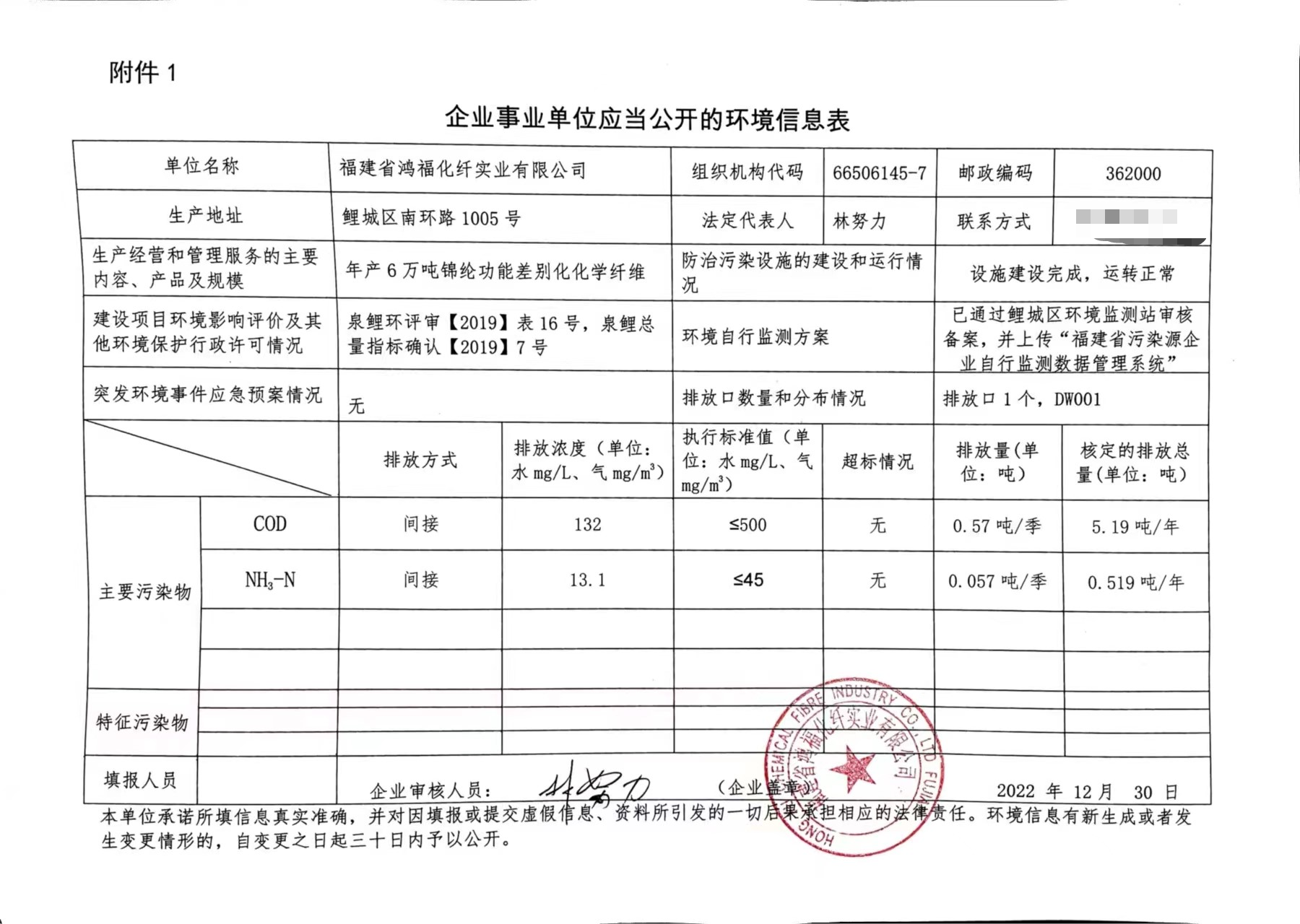 福建省鸿福化纤实业有限公司2022年环境信息公开表