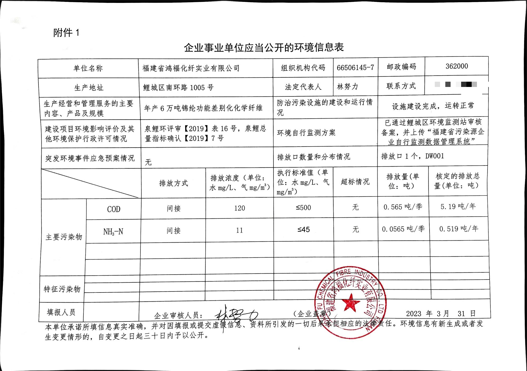 福建省鸿福化纤实业有限公司2023年第一季度环境信息公开表