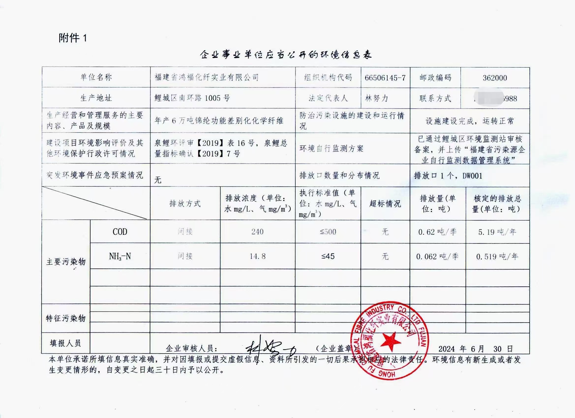 福建省鸿福化纤实业有限公司2024年第2季度环境信息公开表