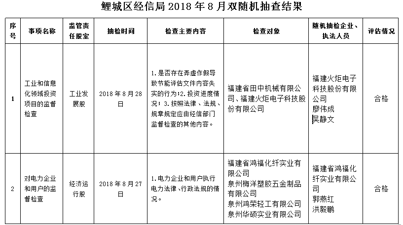鲤城区经济和信息化局2018年8月双随机工作抽检结果
