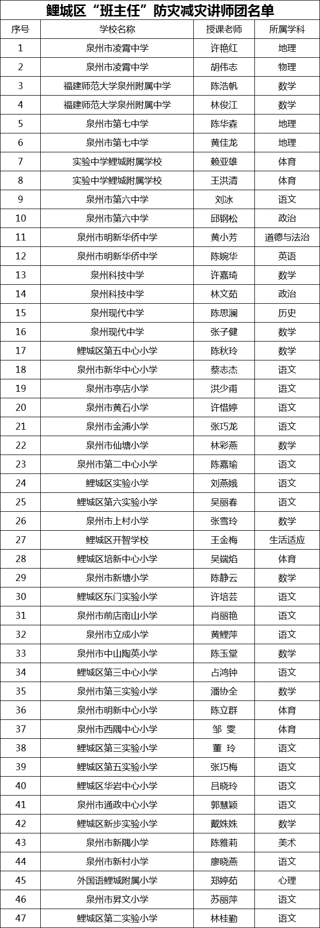 近日,记者从区地震办了解到,为创新防灾减灾安全宣教方式,提升广大师生风险防范意识和能力,鲤城区首个“班主任”防灾减灾讲师团正式成立!据介绍,该讲师团现有成员47名,以区属各中小学相关学科骨干教师为主。
