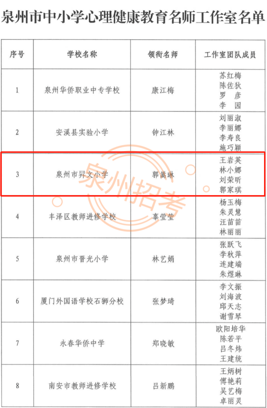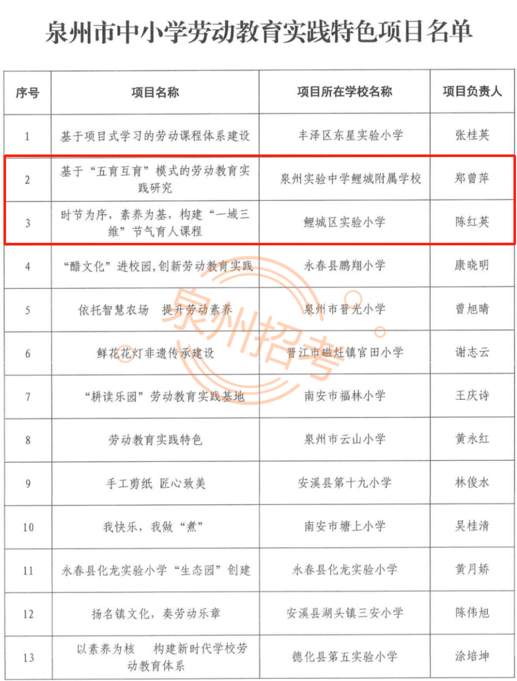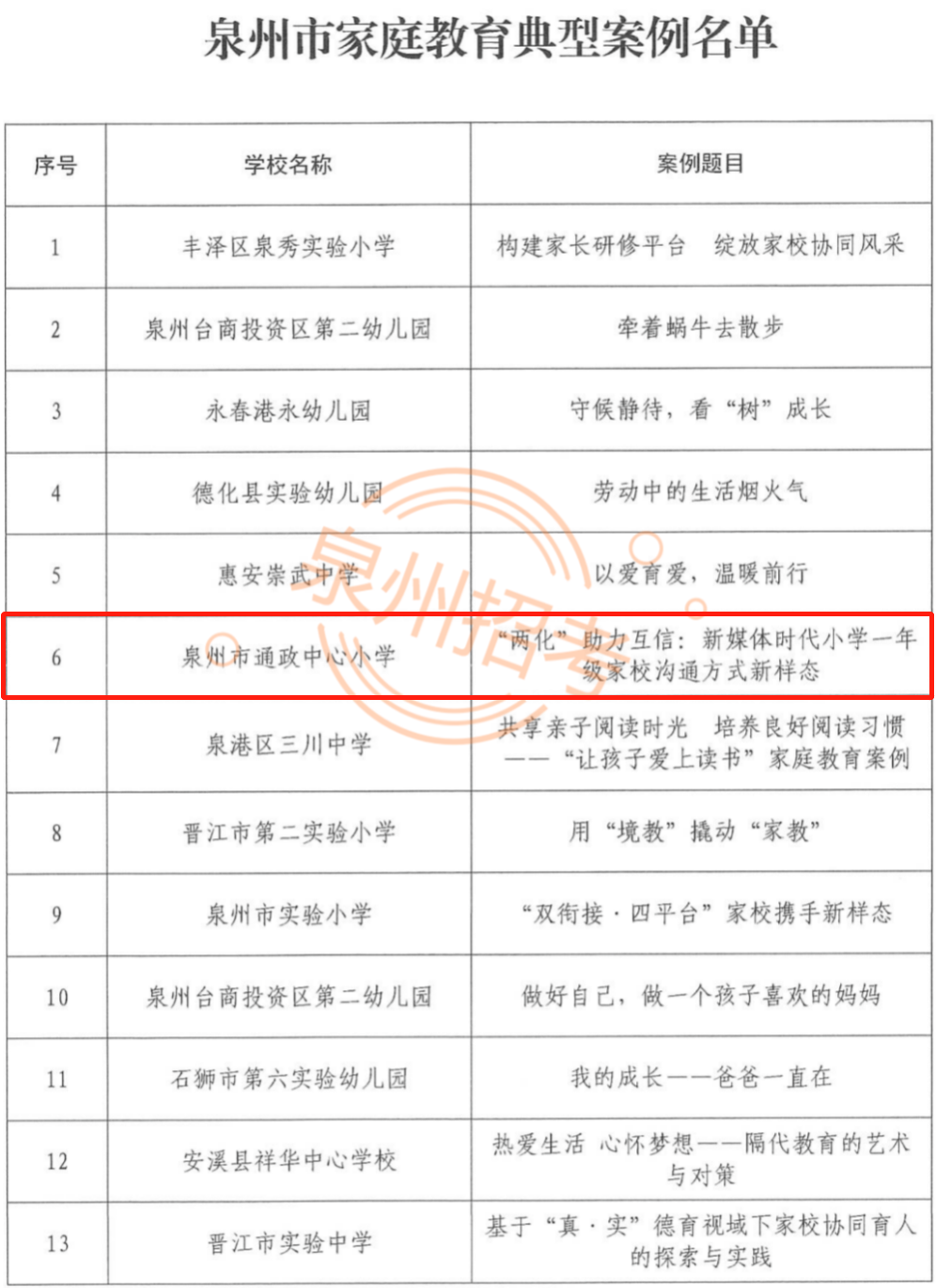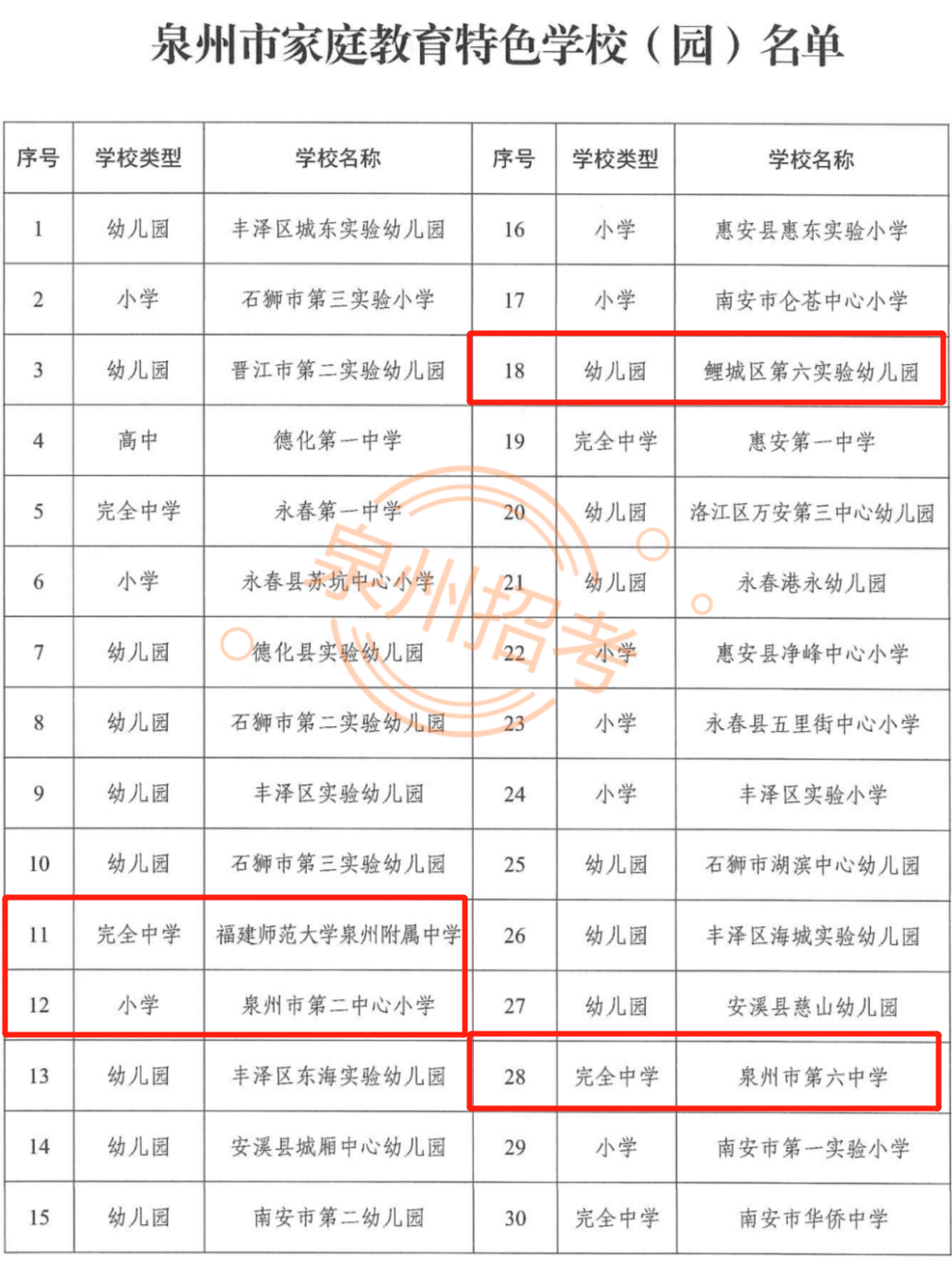 日前,泉州市家庭教育特色学校(园)、泉州市家庭教育典型案例、泉州市心理健康教育特色学校、泉州市中小学心理健康教育名师工作室、泉州市劳动教育实践特色项目等名单公布。鲤城多所学校、多个案例入选快来看看都有哪些吧!据介绍,遴选建设中小学德育特色项目,示范带动全市学校深化教育改革、提升育人水平,是贯彻党的教育方针,落实立德树人根本任务的重要举措。此次入选的案例、项目是在各地各校推荐的基础上,经市教育局组织专家评审出来的。各地各校要围绕促进学生全面发展,广泛开展德育工作研究和实践探索,继续培养一批体现时代特征、具有示范作用的德育特色项目和典型案例(课例),推进“五育并举”各类特色项目学校要进一步完善建设方案,不断创新德育方式,提升项目质量,并积极做好项目成果的宣传、推广和应用工作,切实发挥示范辐射作用。