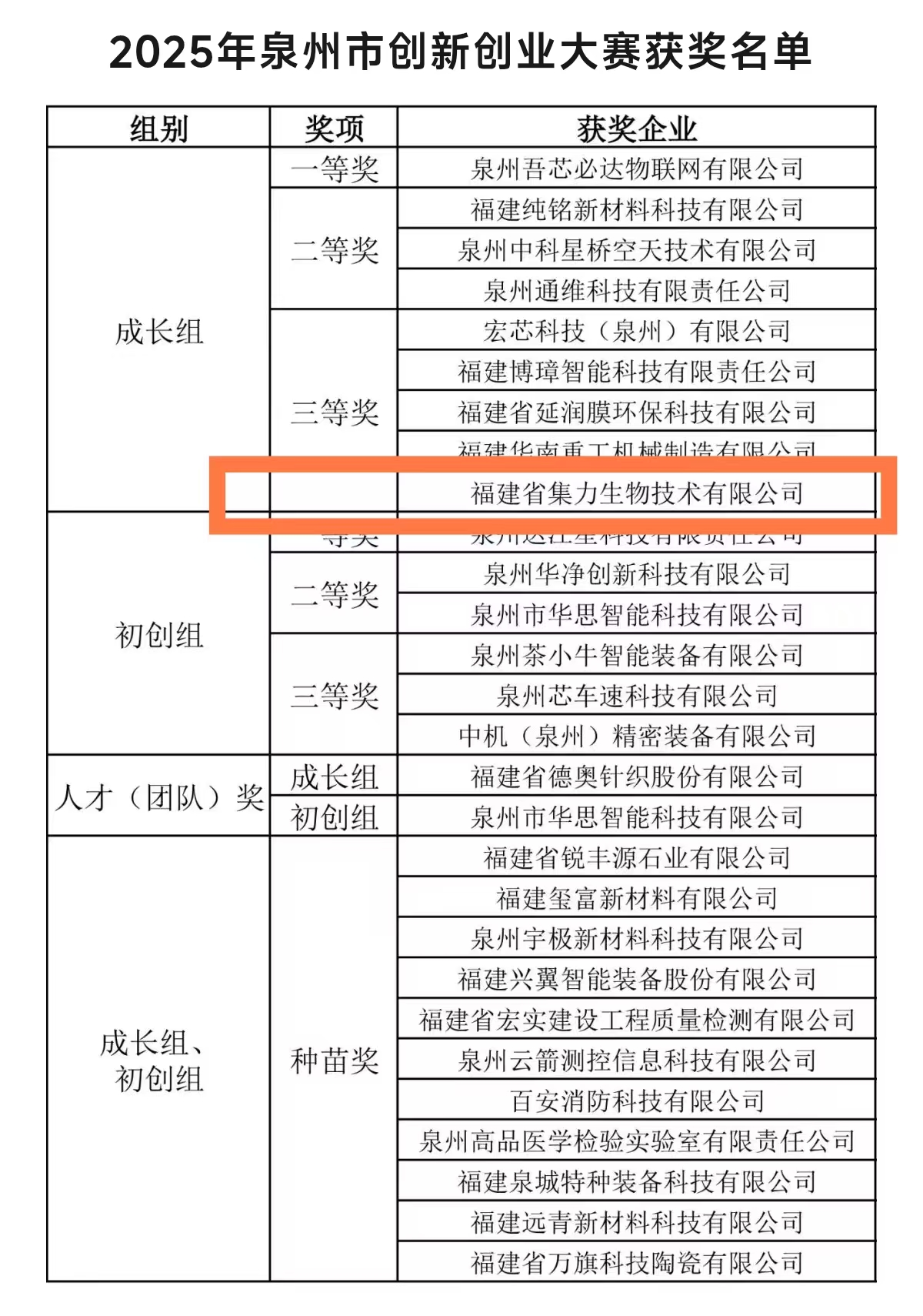 近日,2025年泉州市创新创业大赛落下帷幕,我区福建省集力生物技术有限公司从88个参赛企业中脱颖而出,荣获成长组三等奖,并获市科技局推荐,成功入围第十三届福建创新创业大赛半决赛。