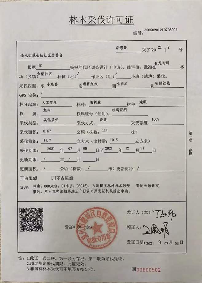 鲤城《林木采伐许可证》(泉鲤集采字[2021]2号)