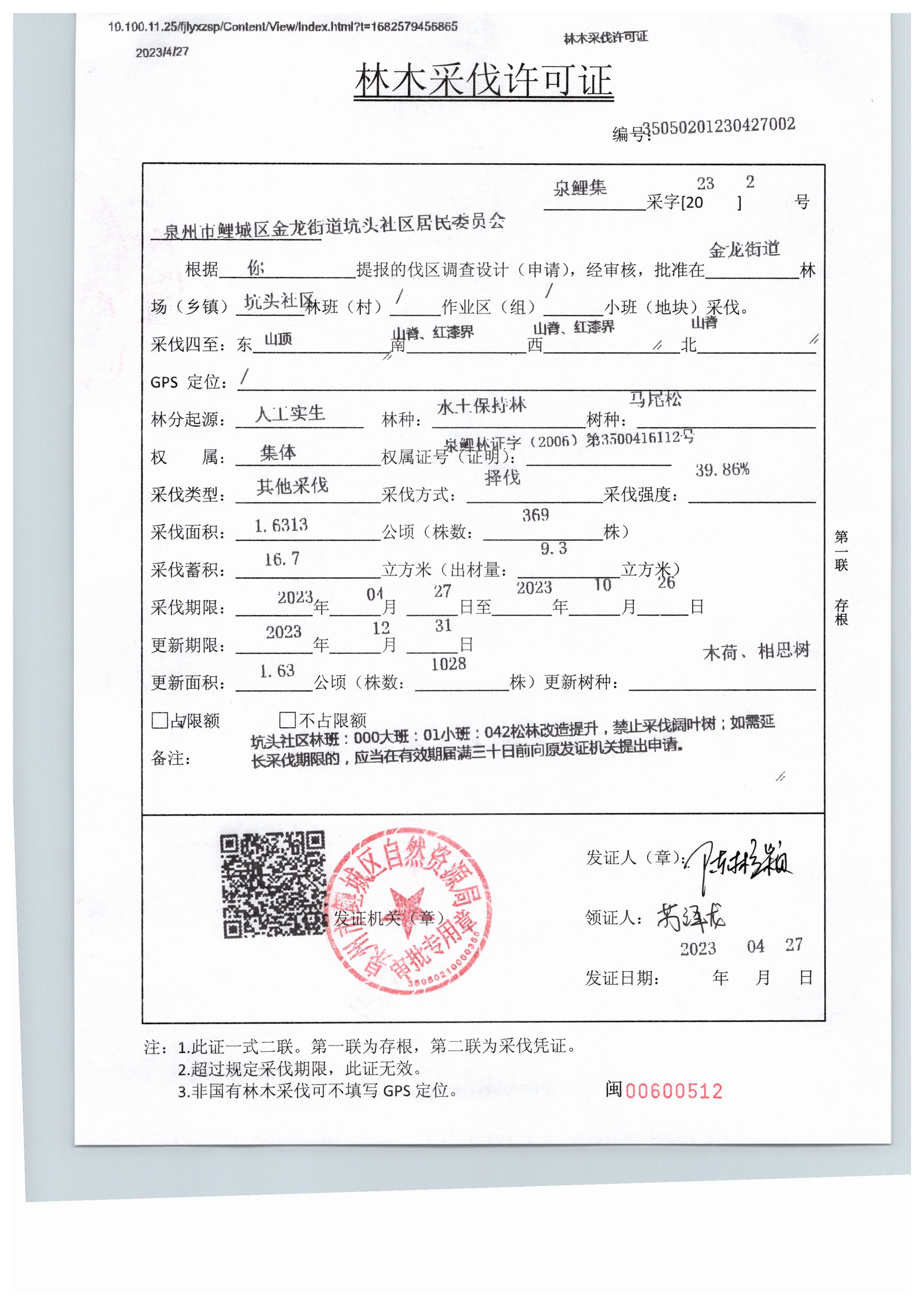 鲤城《林木采伐许可证》(泉鲤集采字[2023]2号)