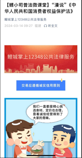 线下,在街道、社区利用LED屏滚动保护消费者权益法治宣传标语等方式向群众开展法治宣传,活动期间滚动宣传标语89余条。线上,充分利用“鲤小司普法微课堂”进行广泛宣传,通过积极转发权威部门、主流媒体相关宣传内容,拓宽消费者权益保障法治宣传教育覆盖面,引导群众以合法的渠道维护自身消费者权益。