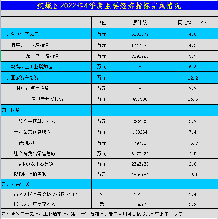 鲤城区2022年4季度主要经济指标完成情况
