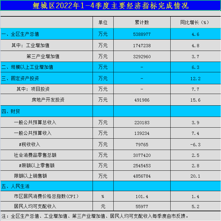 鲤城区2022年1-4季度主要经济指标完成情况