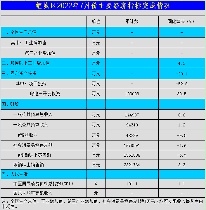 鲤城区2022年7月份主要经济指标完成情况