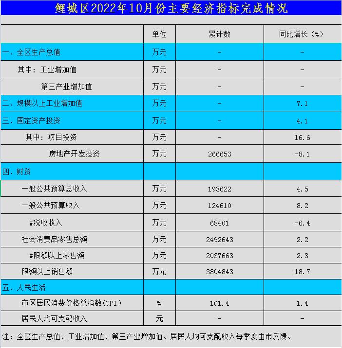 鲤城区2022年10月份主要经济指标完成情况