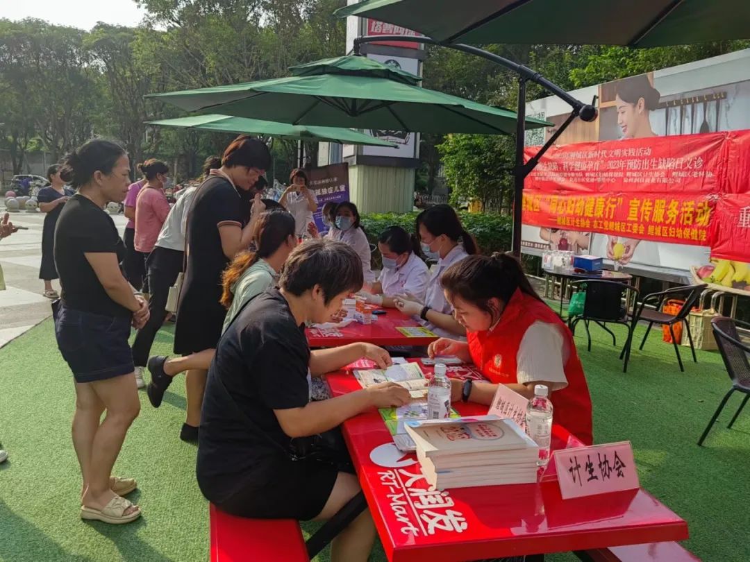 活动现场设立咨询台、义诊台,悬挂放置宣传展板及宣传横幅标语,计生协会志愿者和医务人员化身为科普宣传员,为过往群众讲解预防出生缺陷知识和国家和地方预防出生缺陷和残疾的一系列惠民政策及医疗保障政策。