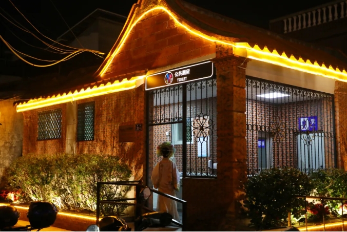 值得一提的是,此次改造中,5座公厕全部增设了夜景亮化设施,在夜幕降临时,匾额灯箱、屋檐线形灯、绿化带地灯会同步亮起,在古厝红砖的映衬下,远远望去,灯火璀璨,既柔和又醒目,为夜晚增添了几分温馨与活力。游客詹女士告诉记者,她和朋友一路循着标识,很容易就找到了厕所,“这些灯光在晚上不仅十分醒目,一个人来上厕所也很有安全感。”