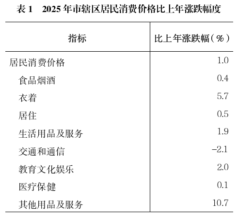价格:全年市辖区居民消费价格比上年上涨1.0%,其中,消费品价格上涨1.1%,服务项目价格上涨0.8%。在八大类居民消费价格中,其他用品及服务类价格上涨10.7%,衣着类价格上涨5.7%,教育文化娱乐类价格上涨2.0%,生活用品及服务类价格上涨1.9%,居住类价格上涨0.5%,食品烟酒类价格上涨0.4%,医疗保健类价格上涨0.1%,交通和通信类价格下降2.1%。
